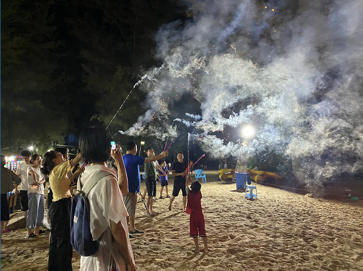 煙火代表一種歡快的日子,在這樣的時光中當然是少不了的,吃累了,喝飽了,唱歌的唱歌,放煙花的放煙花,大家都帶著不嗨不睡的態度,放開了玩,仿佛回到了童年
