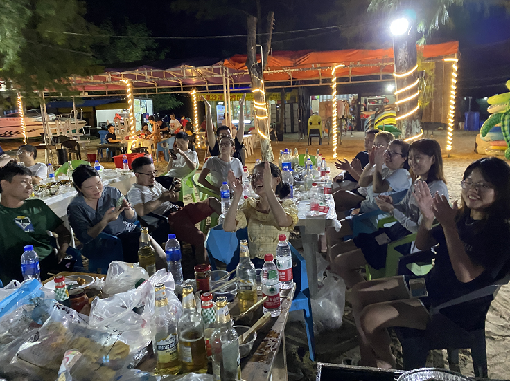 養足了精神,帶上準備好的食材大家來到了海邊,開始搬桌子、擺椅子、搭爐子, 開始海邊燒烤,男女搭配干活不累,大家分工合作,不一會兒,香噴噴的味道就迎著海風撲面而來,我們看海上升明月,對酒當歌!